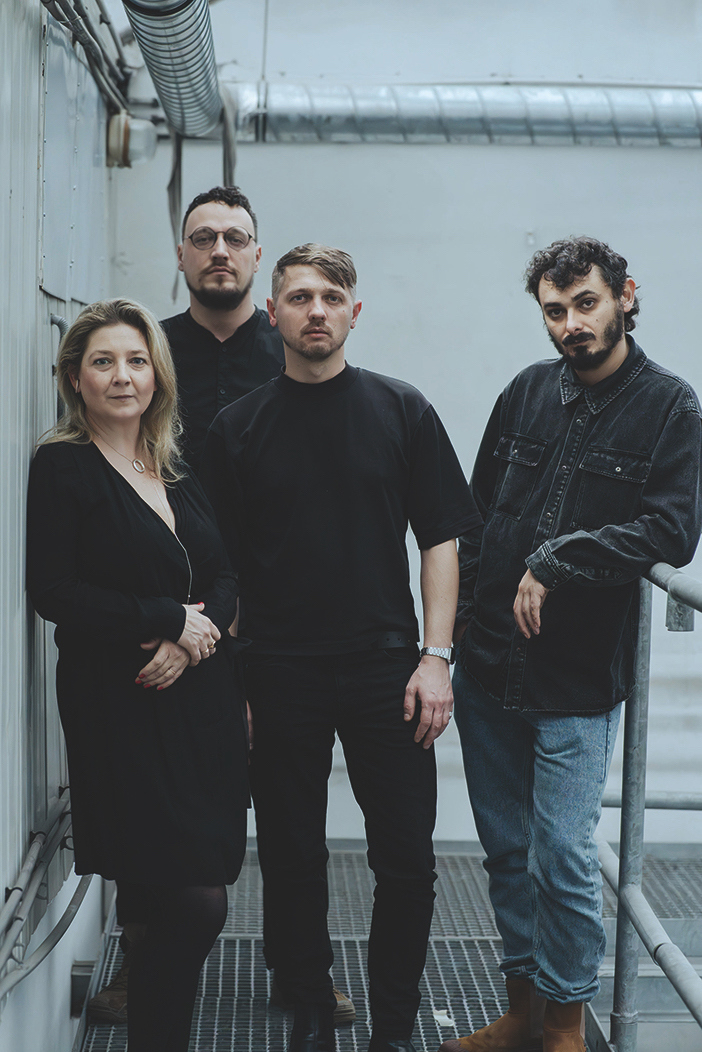 La curatrice Marta Czyż con i membri di Open Group: Yuriy Biley, Pavlo Kovach e Anton Varga. Foto Piotr Czyż