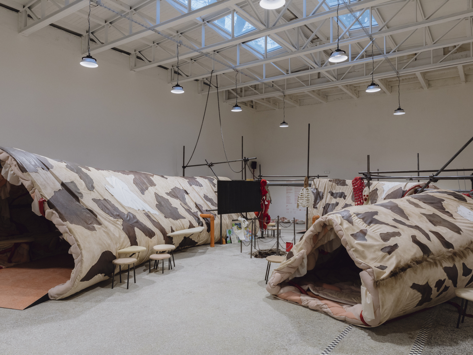 Impiegando la logica del ribaltamento propria del carnevale, Guerreiro do Divino Amor scardina le narrazioni di identità nazionale identificandole come finte costruzioni e mettendo in ridicolo i cliché con cui queste vengono solitamente identificate. Nel Padiglione della Svizzera l’artista svizzero-brasiliano presenta due progetti, rispettivamente il sesto e il settimo capitolo del suo progetto in divenire «Superfictional World Atlas»: «Il Miracolo di Helvetia» è proiettato sulla cupola di un edificio neoclassico, un misto tra una chiesa, una banca, un tribunale e la facciata del Padiglione Centrale dei Giardini, ed è dedicato a una minuziosa demolizione del concetto di «Svizzera»; in «Roma Talismano», presentato su un sistema di ventole olografiche 3D, l’artista e performer Ventura Profana, con sei mammelle come la lupa capitolina, canta, su composizioni musicali barocche, strofe che vanno a minare i concetti e i simboli su cui si basa la presunta superiorità della cultura occidentale. Se in un primo momento si rimane sbalorditi dall’abbondante uso di un’estetica ispirata ai video musicali, al linguaggio delle soap opera e alla cultura pop, a una visione più attenta ci si rende conto della seria e approfondita ricerca svolta dall’artista, e dalla sua capacità quasi alchimistica di tradurre concetti, fatti e connessioni legati alla geopolitica in simboli apparentemente distanti dal loro significato originario.