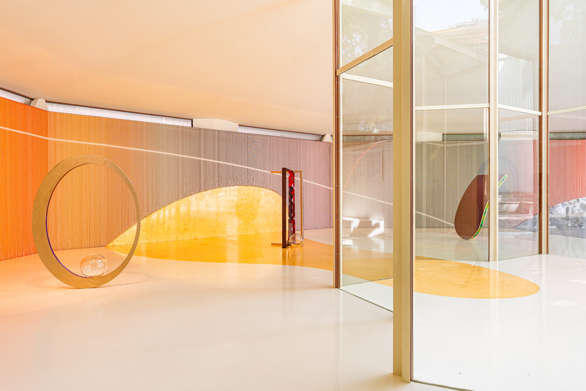 Kapwani Kiwanga interviene con grande eleganza sul difficile spazio spiraliforme del Padiglione del Canada, ricoprendolo interamente di conterie, perline in vetro di Murano che, in passato, furono usate come valuta dai commercianti europei. Le conterie venivano offerte alle popolazioni Africane e delle Americhe in cambio di oro, avorio, legni preziosi e umani in schiavitù. La rarità, il processo di produzione segreto e la loro provenienza rendevano le conterie particolarmente preziose, tanto da diventare una forma di moneta tra le popolazione con cui venivano scambiate. Osservarne a migliaia, sapendo che sono fatte di sabbia e ossidi di metallo, non può che farci riflettere sui meccanismi che portano ad attribuire valore a un oggetto, e il peso che queste decisioni hanno avuto a livello sociale nel commercio transoceanico.