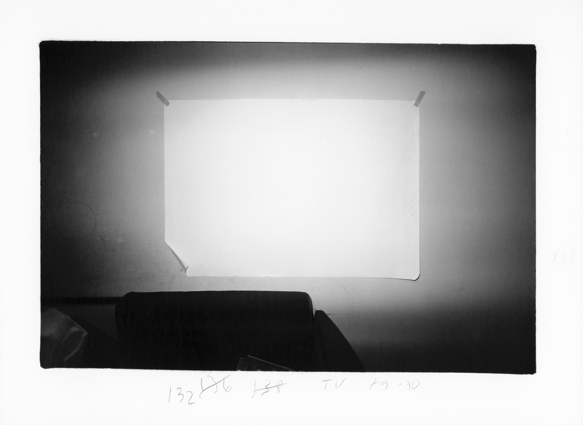 L’ombra, nell’opera di Guidi, appare in diversi modi, come del resto la luce che qui è quella della luna, lì è quella del sole, a volte è un colpo violento di flash, in altri momenti, invece, è una strana miscela di luce naturale e artificiale. A volte, l’ombra si posa su un muro, su un albero, su una strada o su un marciapiede. In alcune immagini nella penombra, una lama sottile di luce accarezza il volto di una bambina addormentata (è Anna, la figlia dell’artista). In alcuni momenti siamo di fronte a veri e propri «esperimenti», come quello svolto a Ruffio, il 4 dicembre 1977, dove Guidi fotografa per tre volte la stessa parete vuota, dove compare l’ombra di una finestra e dei rami di vegetazione fuori dalla stanza. Per ciascuno scatto, l’artista inserisce dell’inquadratura, in basso a destra, una lavagnetta su cui ha segnato l’orario dello scatto: «Ore 16,10», «Ore 16,20», «Ore 16,30». Sono le prove generali di quella che, sei anni dopo, diventerà una delle serie più iconiche di Guidi, Preganziol, dove l’esperimento è prolungato per diversi scatti, assumendo un effetto poetico struggente (l’opera, ora acquisita di recente dal Centre Pompidou di Parigi, non è in mostra).