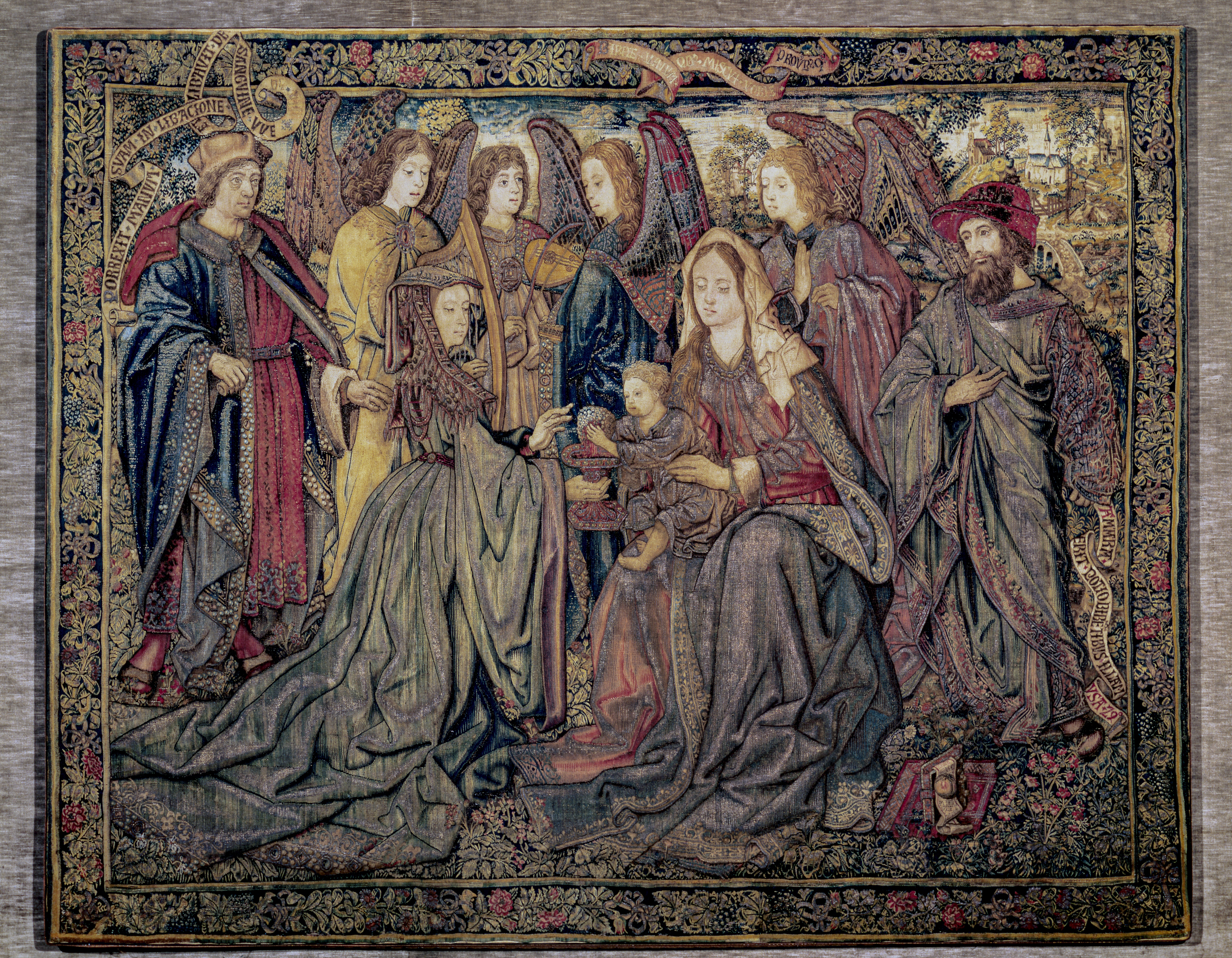 In ultimo tra i numerosi esemplari non esposti meritano menzione tre raffinatissimi arazzi fiamminghi a soggetto sacro di piccole dimensioni eseguiti probabilmente a Bruxelles tra la fine del Quattrocento e gli inizi del Cinquecento come paliotti o pale d’altare, tra cui spicca il bellissimo «Grappolo Mistico» cosiddetto dalle iscrizioni nei cartigli dei profeti che rimandano al delicato gesto del Fanciullo divino colto nell’atto di spremere il frutto quale prefigurazione della sua futura Passione.