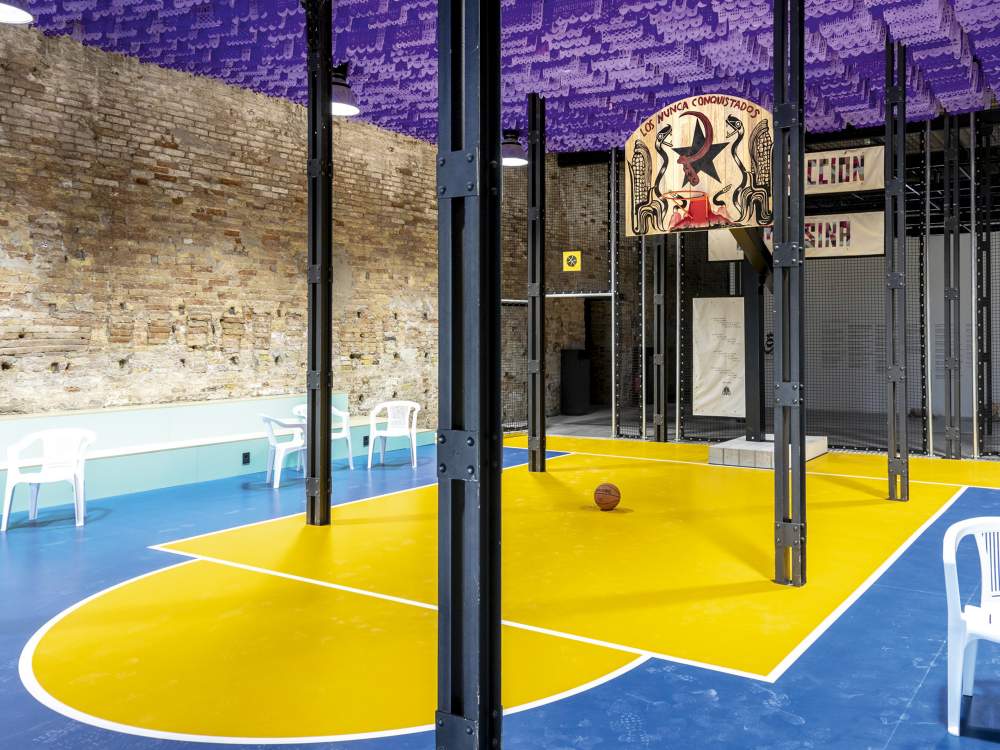 Caotica ricostruzione di un campo da basket, volutamente disordinato e rumoroso. Palestra all’Arsenale, ha un valore di testimonianza in termini di coesione sociale per le comunità indigene. Ma offre pochi motivi per essere ricordata.