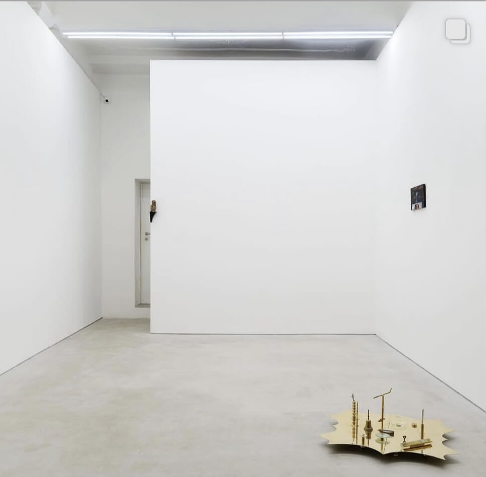 Impossibile non associare i due artisti ai due protagonisti delle avventure narrate nel volume. D’altra parte, una mostra a quattro mani è sempre un tentativo di intraprendere un viaggio, piccolo o grande che sia, insieme. Le quattro opere esposte sembrano tracciare alcuni punti dell’itinerario di questo viaggio con una scultura in ottone di Cavaliere a terra in primo piano all’ingresso, le due opere a parete che si fronteggiano e in uno spigolo del muro sulla facciata in fondo alla galleria la minuta scultura di Cucchi ad altezza degli occhi. Il lavoro che più colpisce è il piccolo olio su tavola (cm 20 x 35) con l’inserimento di una placca in alluminio di Enzo Cucchi intitolato «Tornando». Per la bellezza del paesaggio sullo sfondo e per l’insieme enigmatico viene da associarlo alla serie dell’artista di opere di piccolo formato intitolata «Roma» del 1990 che rappresenta uno dei suoi momenti più riusciti e affascinanti. Se «Tornando», opera del 2023, indica il desiderio di Cucchi di ritornare a presentarci lavori di questa qualità e bellezza, il suo è davvero un bel ritorno.