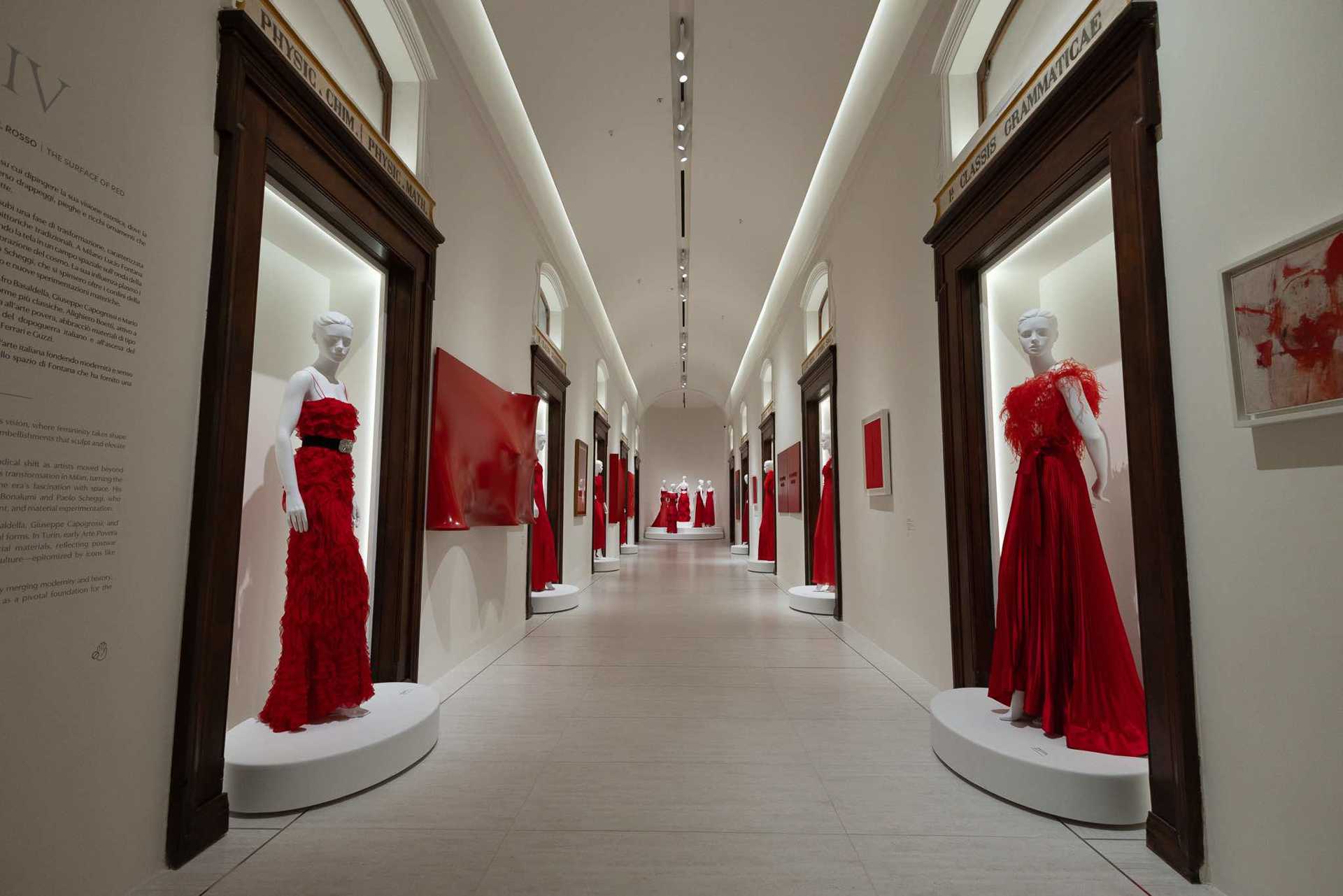 Clyfford Still, Cy Twombly, Francis Bacon, Louise Bourgeois, Gerhard Richter, Helen Frankenthaler, Marlène Dumas e Mark Rothko sono i grandi nomi dell’arte internazionale (molti dalle raccolte di Garavani e Giammetti, altri in prestito da collezioni private e istituzioni museali) a fare da corona alle creazioni d’alta moda, drappeggiate su bianchi manichini. Fra ricami, seta e piume di struzzo, c’è il ritratto di Valentino eseguito da Andy Warhol, mentre un dipinto di Jean-Michel Basquiat ha figure nere su sfondo cremisi.