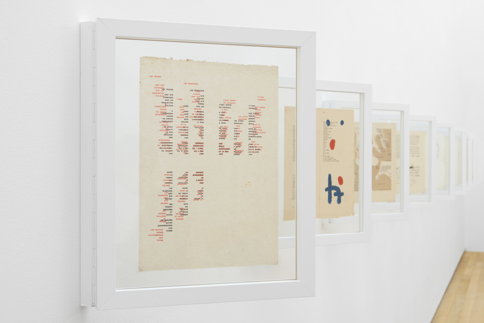 Nella sala al secondo piano della Fondazione troviamo una copia di questo prezioso volume: è composto da 26 fogli non rilegati, piegati in quattro e avvolti in copertine a gruppi di cinque; i plichi sono contenuti in una scatola, avvolta in una copertina di pergamena, a sua volta contenuta in una scatola di cartone. Questa pubblicazione insolita, che si presta a una lettura libera e interattiva, insieme alla sua altissima qualità esecutiva, presenta molte affinità con la struttura della «Boîte» di Duchamp, ed è probabilmente per questi motivi che l’artista lo contattò per lavorare alla serie C dell’opera. Nella stanza troviamo il carteggio tra i due, insieme a schizzi e calcoli eseguiti da Iliazd per apportare migliorie alla struttura. Scorrendo i materiali non possiamo che affezionarci a questa persona, alla sua costante ricerca della qualità, alla coerente applicazione del suo «tuttismo», così come non possiamo non notare che l’intero progetto espositivo è fatto di tanti frammenti che possono essere ricomposti liberamente dallo spettatore, e nella sua forma espansa ma non casuale richiama le stesse modalità di fruizione della «Boîte-en-valise», così come quelle del «Poésie de mots inconnus».