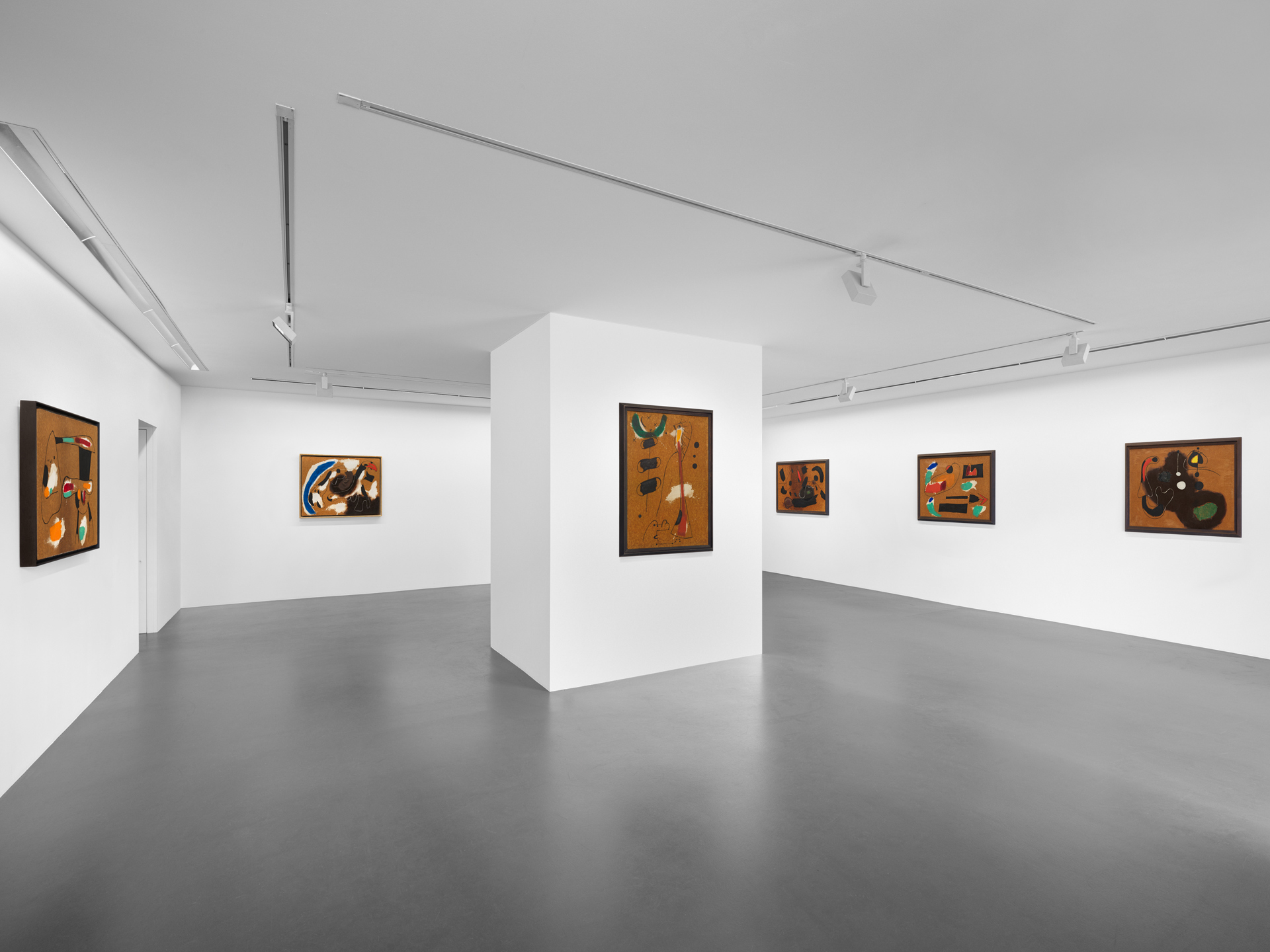 La prima riunisce sette rare opere della celebre serie dei dipinti su masonite, che Miró realizza in Spagna durante l'estate del 1936. «Iniziata pochi giorni prima dello scoppio della guerra civile spagnola, la serie è ampiamente considerata come una delle opere più importanti della carriera di Miró, rappresentando un momento cruciale di rottura e transizione: furono le ultime opere che Miró realizzò in Spagna prima di fuggire a Parigi», ha sottolineato la galleria. Le opere di questa serie sono state esposte al MoMA di New York, alla Tate Modern di Londra, all'Art Institute di Chicago e alla Fundació Joan Miró di Barcellona. La loro importanza risiede, in particolare, nell’incarnare la massima espressione della provocazione lanciata quasi un decennio prima dall’artista, quando, nel 1927, dichiarò pubblicamente la sua intenzione di “assassinare la pittura”. In queste opere Mirò applica la materia pittorica direttamente sui pannelli in masonite (un materiale industriale in fibre di legno compresse inventato nel 1924 e impiegato nell’edilizia), la cui superficie, visivamente irregolare, diventa parte integrante dell’opera ed è percorso da fome definite da linee nere continue parzialmente riempite di colore, in una composizione molto materica realizzata con colori a olio, caseina, catrame e sabbia, che trasmette un senso d'urgenza espressiva e profonda irrequietezza.