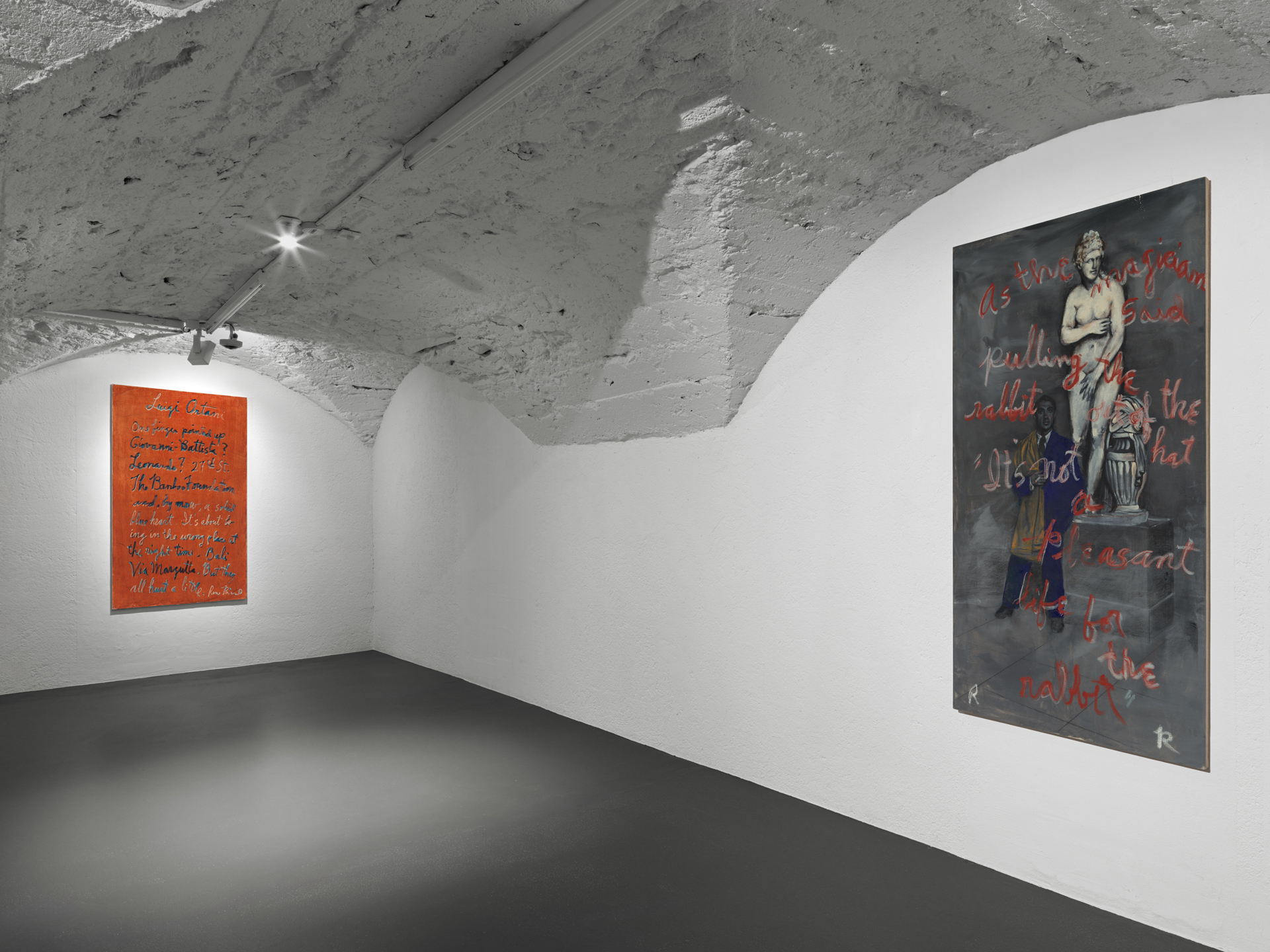 This tension can also be found in the second exhibition in the gallery, dedicated to Rene Ricard (1946–2014), an American poet and painter, a figure intrinsically linked to Vito Schnabel's training in the visual arts and to the history of the gallery, which has dedicated five solo exhibitions to him in New York, Los Angeles and London over the last twenty years. This exhibition features six works in which, starting in the 1980s, Ricard transformed his poems into paintings, using only text or combining images and words. «Occasionally Ricard would paint directly on antique prints or found paintings. - Explained the gallery - In his later work, Ricard expanded his ambition, working on a larger scale with fully integrated imagery and text.
