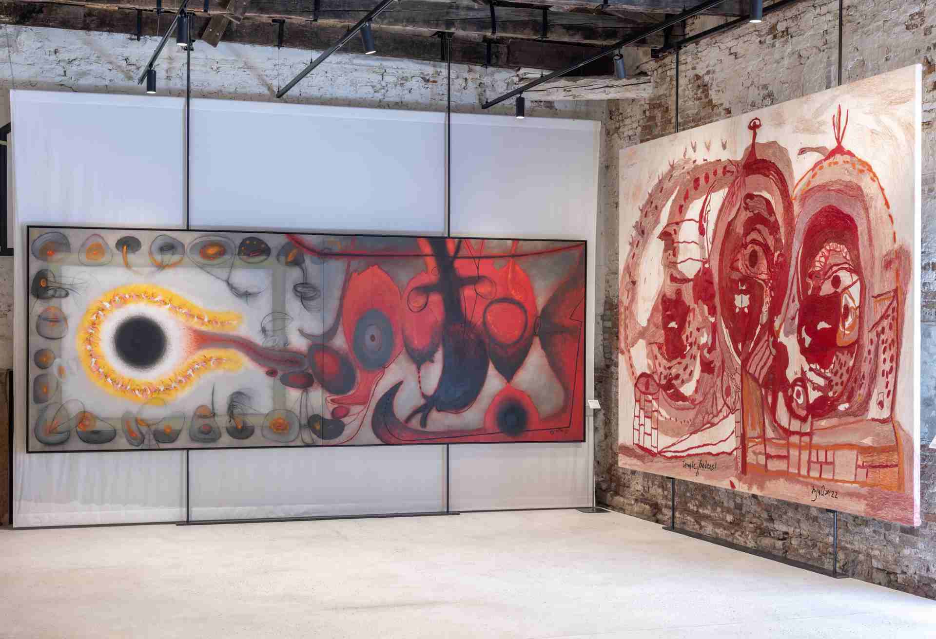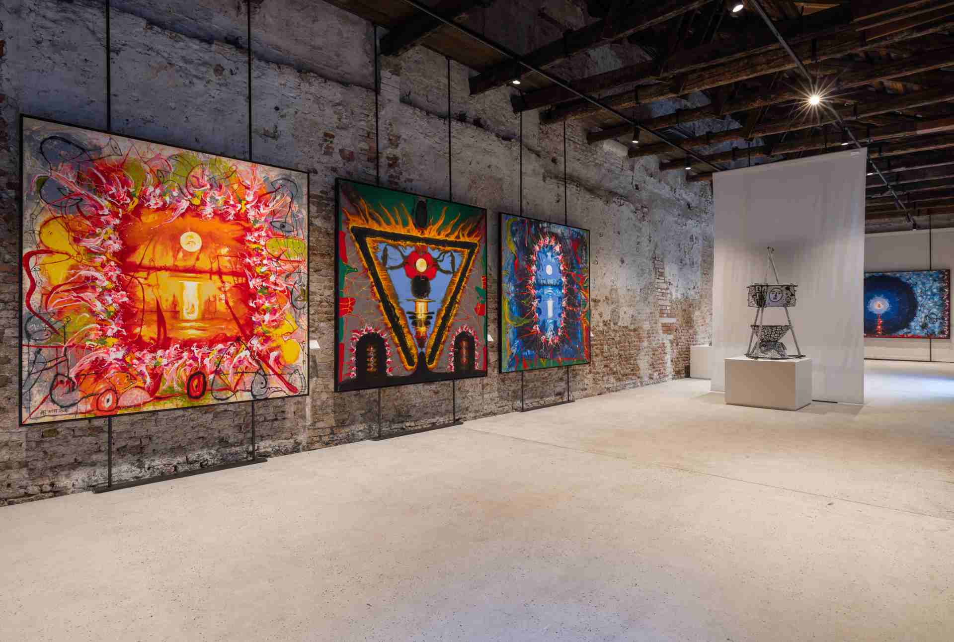 La natura, la sessualità, l’armonia cosmica di maschile e femminile, la forza distruttrice, e la carica rinnovatrice che ne consegue, incarnata dalla divinità indù Shiva trovano rappresentazione nei dipinti di Manu. A fare da contrappunto all’accento astratto dei suoi quadri, che incorporano elementi di modernismo, la pittura simbolica ispirata alla mitologia indiana dell’autodidatta Madhvi, in cui confluiscono e si mescolano ricordi d’infanzia, leggende e storie popolari. Le sue grandi tele rivelano l’intima connessione degli esseri umani con le divinità e con l’universo animale e vegetale che popola la biosfera. Un approccio più istintivo all’arte, rinvenibile anche nelle sculture realizzate con «objets trouvés» tratti dal contesto quotidiano e domestico.