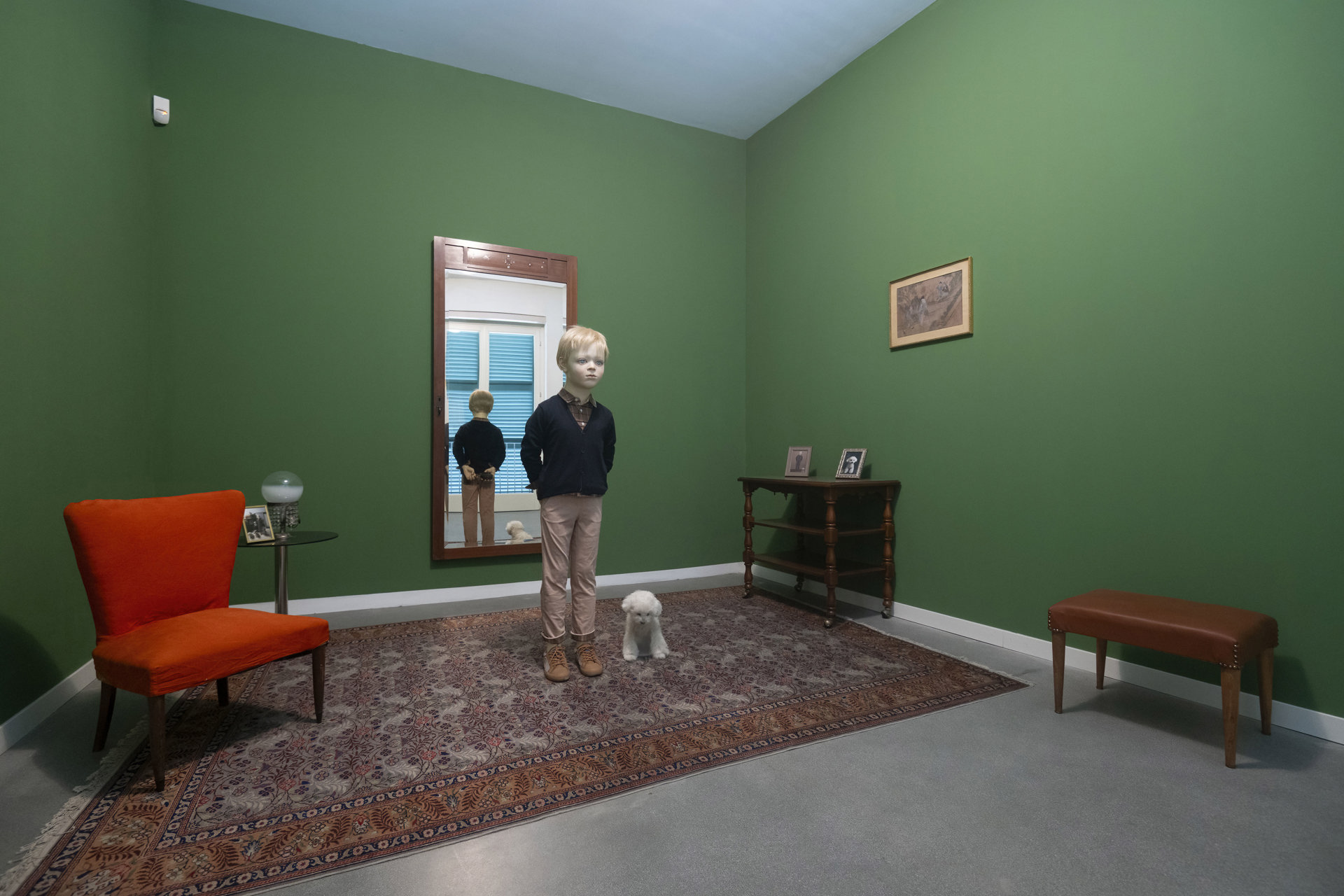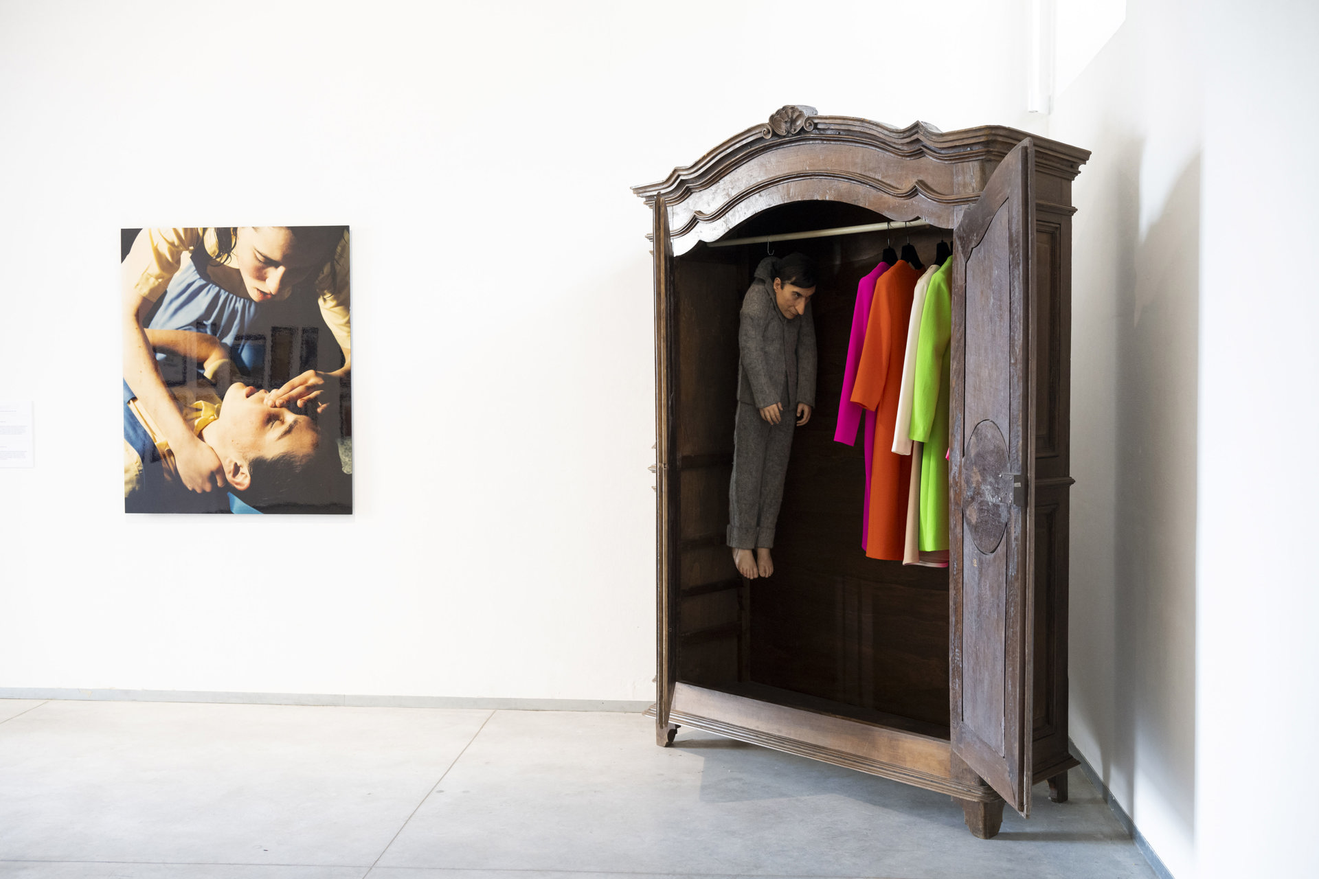 Molte delle opere in mostra sono state create in un periodo in cui gli artisti si chiedevano che cosa potesse o non potesse essere un’opera d’arte, e questo lavoro ne è un emblema: ha la forma di un dipinto ma non ha un soggetto fisso, è opera ma anche spazio espositivo, ha una funzione pratica (le opere solitamente non ne hanno), è didascalia di sé stessa e si presta a essere didascalia di altre opere: in questo caso i curatori l’hanno impiegata per esporre il testo introduttivo alla mostra, la lista degli artisti e alcuni inviti a progetti passati della Fondazione. Altre opere si configurano come contenitori, o capsule del tempo: l’impraticabile casetta di Mark Dion, «Office of the Censor» (1996), contiene una polifonia di oggetti accuratamente selezionati ma non consultabili, avverando implicitamente la sua natura di «ufficio del censore» e ironizzando sull’inaccessibilità dei reperti conservati nei musei; «Chanel fall-winter 94/95» (1994) di Silvie Fleury è un tappeto fucsia su cui sono sparse riviste di moda di trent’anni fa, pubblicazioni che proponevano modelli estetici tanto inarrivabili quanto sintetici, e di conseguenza l’opera oggi conserva inalterata la sua freschezza come un mazzo di fiori finti; «Untitled, Ceiling» (1993) di Rachel Whiteread è il calco della porzione di un soffitto proveniente da una casa di epoca vittoriana ormai demolita: reso in gesso e installato a pavimento, questo piatto monolite bianco ci ricorda quanto la nostra percezione del tempo dipenda dal modo in cui viviamo lo spazio, e che gli oggetti, come le opere d’arte, hanno sempre bisogno di una narrazione per raccontarsi al presente, e di qualcuno che si prenda l’impegno di coltivarla, aggiornarla e tramandarla.