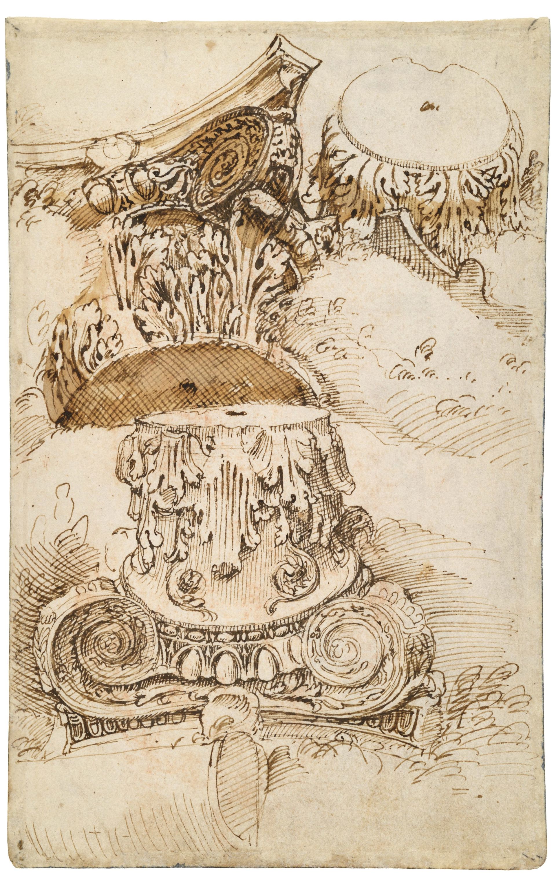 Maarten van Heemskerck, «Quattro capitelli e un fusto di colonna interrati», post 23 maggio 1532, Staatliche Museen zu Berlin, Kupferstichkabinett. © Staatliche Museen zu Berlin, Kupferstichkabinett (Dietmar Katz)