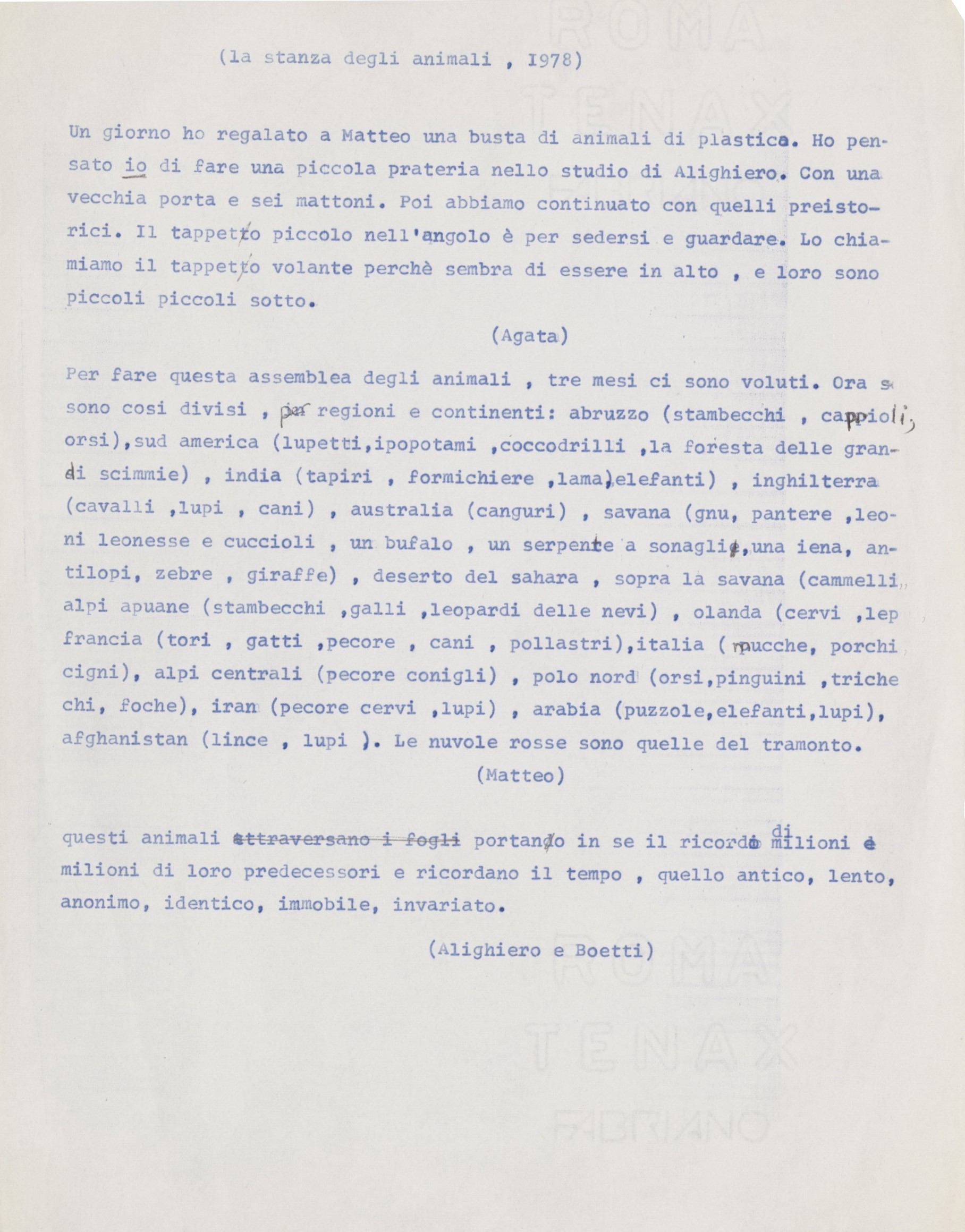 Avviarsi nel percorso espositivo significa entrare nel flusso temporale da lui concepito (1973): «(…) io sto diventando partigiano dei tempi lunghi (…). Nel mio lavoro il procedere del tempo mi porterà più esperienza, più conoscenza, una visione generale un po’ cosmica (non però intellettuale)». I documenti disposti su due pareti della prima stanza, secondo quell’idea di «caso» precipua dell’artista torinese, comprendono, per esempio, gli studi per «Cimento dell’armonia» e l’invenzione e altri studi per «Lavoro Postale», entrambi del 1969, l’unico bozzetto finora noto per le «Mappe» (1970), ma pure una cartolina spedita alla moglie Annemarie, in cui, sul retro di una foto di un cervo, scrive «I love you baby, Frank Sinatra», il passaporto dell’artista sedicenne e una foto del tempo della scuola. Il cardine della mostra sono due opere. Sulla parete di fondo della galleria è ricostruito il «Muro», work in progress tra il 1972 e il 1993, in cui Boetti aggiunge e toglie cose scelte e incorniciate, come un quadro di Salvo, una foto con Francesco Clemente, inviti, lettere e cartoline con amici artisti, poesie di Penna e altre immagini di natura diversa; così lo ha definito Anne Marie Sauzeau, (2001): «(…) iconostasi privata della sua esistenza e del suo dialetto, nonché come taccuino di appunti, di progetti da sviluppare». In una stanza adiacente l’altra opera, «Zoo»: «Trascorrevamo ore dal giornalaio, il mitico Nando, acquistando riviste d’informazione del mondo che servivano a Boetti per le “Copertine” e le buste con gli animali di plastica per me e mio fratello Matteo, racconta Agata Boetti. In un angolo del suo studio avevamo creato una prateria, alla quale avvicinammo un tappeto, o meglio un “tappeto volante”, sul quale giocavamo tutti e tre a vedere dall’alto i piccoli animali».