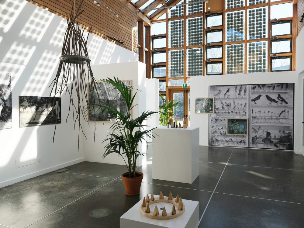 Tra memoria, archivio e natura, tale posizione si evince da subito nella sala centrale del PAV. Accompagnati da «Senza titolo (Canti)» (2021) di Edoardo Manzoni, una registrazione di cinguettii riprodotti artificialmente da un cacciatore, si ha la sensazione di attraversare un «jardin de verre». Ci si sente in bilico tra due mondi: da una parte una sala dei trofei di stampo ottocentesco, dall’altra una giungla esotica in cui le sculture di Manzoni, come «Senza titolo (Fame)» (2020), cadono dall’alto riprendendo l’estetica delle trappole e mimetizzandosi tra le piante. Tale effetto è potenziato dalle stampe fotografiche a parete di Daniele Marzorati, «Archivio-Erbario etopico» (2020-21) e «Passers» (2021), quinte sceniche di un gioco tra artificiale e naturale.