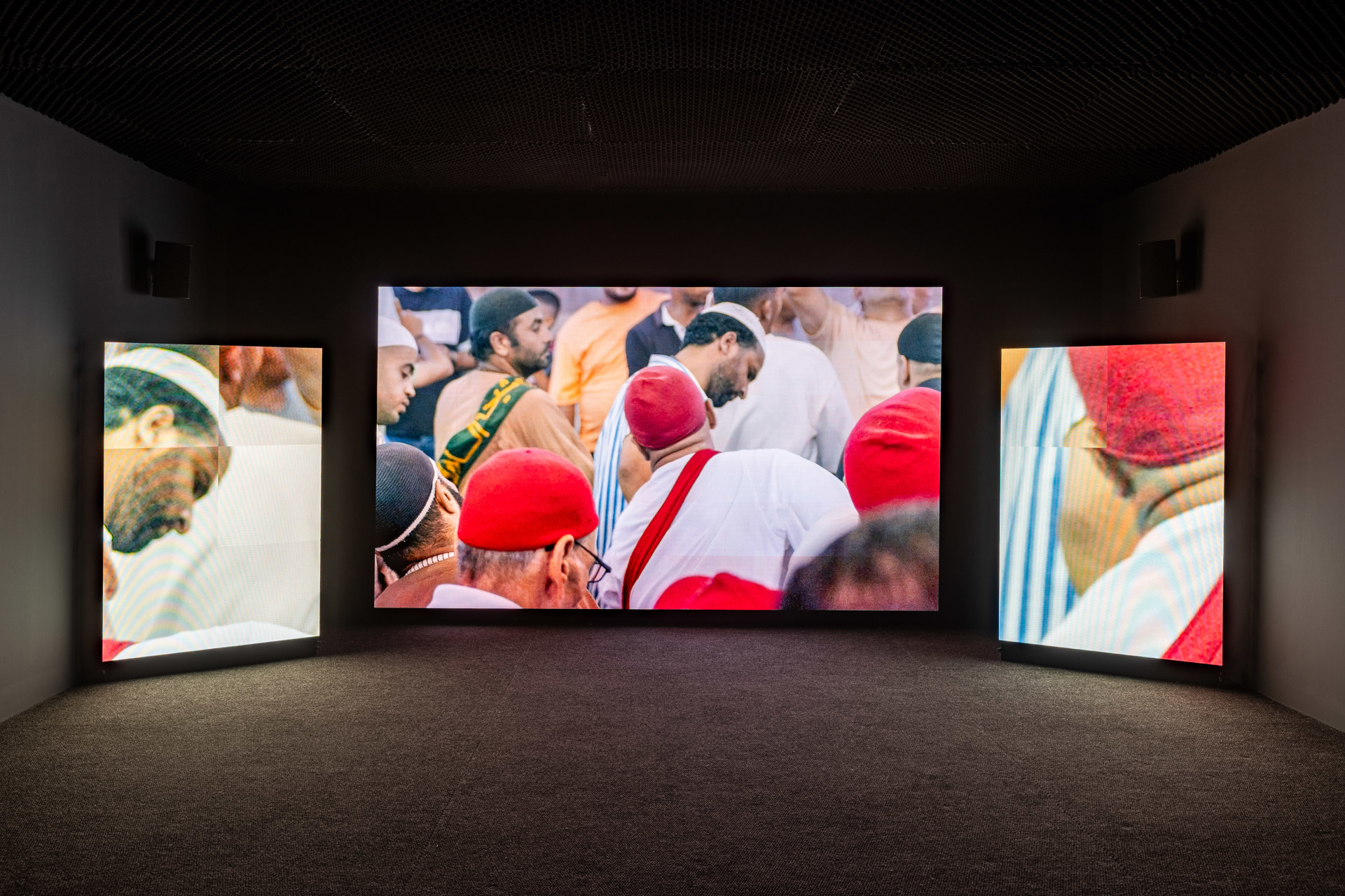 L’installazione sonora di Ayman Zedani si apre con una voce che recita «Ha guardato nell’infinità dell’oceano e si è augurato di poter capire tutte le preghiere cantate dai pesci», citando l’episodio biblico (e coranico) del profeta Giona e la balena.