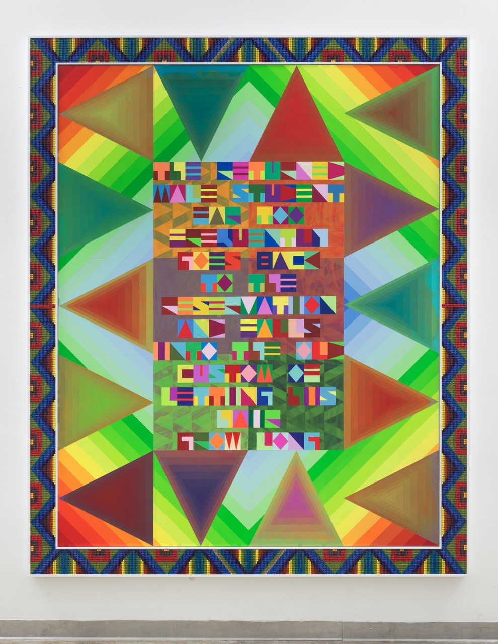 L’universo di Gibson (Colorado Springs, 1973) è fatto di geometrie e colori sgargianti, di perline di vetro e trame tessute con le tecniche artigianali dei suoi antenati, di parole ricamate tra le forme. Una ricchezza estetica che diventa strumento per esplorare le complessità della propria identità e per denunciare le ingiustizie sistemiche sofferte dal suo popolo. In questa mostra Gibson incorpora nel suo lavoro anche stralci di documenti legali del XIX e del XX secolo, citazioni di protagonisti del movimento per i diritti civili, passi di poesie e canzoni pop. L’opera da cui la mostra prende spunto, acquisita da The Broad dopo la presentazione a Venezia, contiene una citazione di una lettera del 1902 in cui il Commissario per le questioni Indiane si rivolgeva al preside di una scuola californiana esigendo che gli studenti nativi acquisissero gli usi, l’abbigliamento e le apparenze dei bianchi. L’opera, dal titolo «The Returned Male Student Far Too Frequently goes Back to the Reservation and Falls into the Old Custom of Letting His Hair Grow Long», trasforma la sistemica repressione culturale in un gioioso atto di rivolta, che è allo stesso tempo una celebrazione della propria identità.