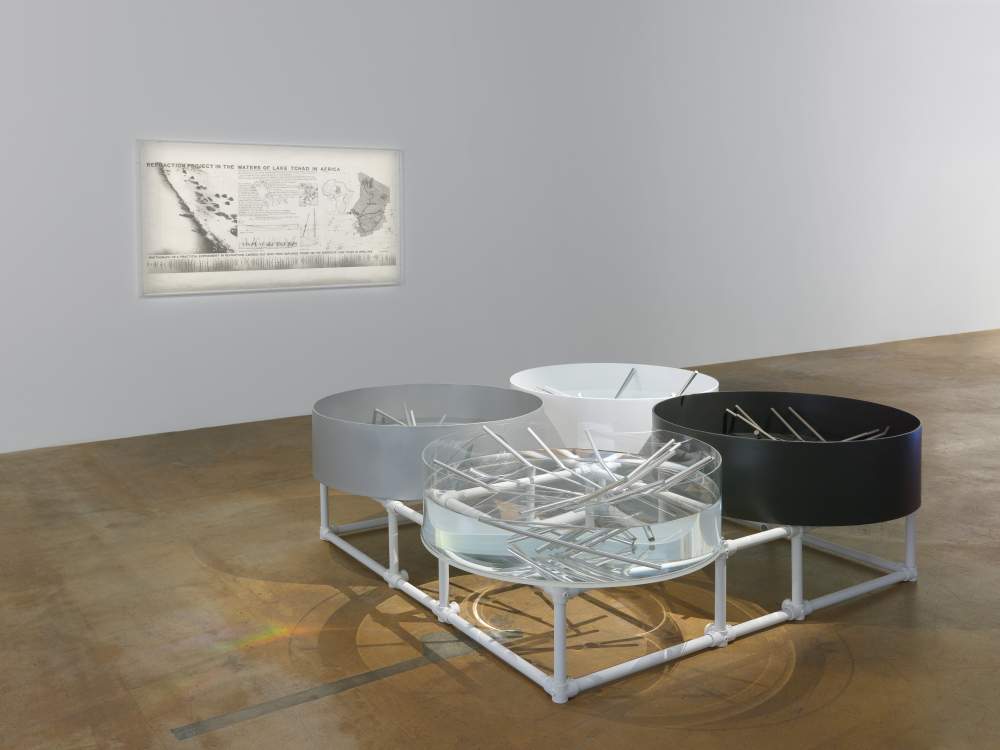 «Refraction» (1968) e «Wind Room» (1968), due delle installazioni presenti in mostra, sono un esempio: la prima ricrea l’effetto della rifrazione delle dune sulla superficie del Lago Ciad alla luce del tramonto; la seconda, invece, è un’idea nata da una tempesta di vento che colse di sorpresa l’artista nel Sahara. Quell’evento portò Grisi a osservare questo fenomeno in modo scientifico e a collezionarne differenti immagini fatte in diversi Paesi e contesti ambientali (foreste, città, oceani). Da qui l’idea di creare un vento a 40 nodi in una galleria, di riprodurre ancora una volta in un ambiente chiuso la sensazione di un fenomeno naturale e di alterare così la struttura e la percezione dello spazio circostante.