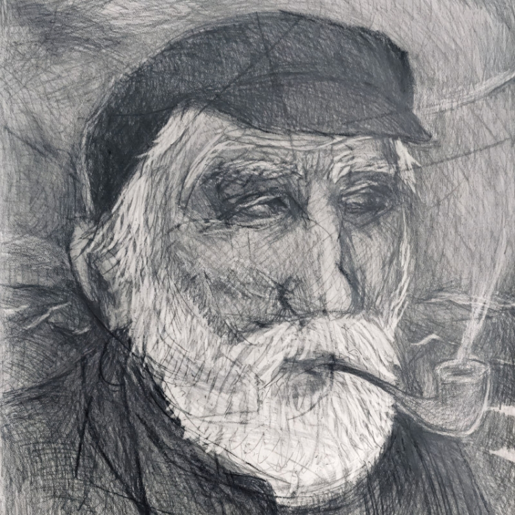 Disegnare a memoria. Una dama con un uccellino disneyano in mano guarda il fruitore con un sorriso furbetto. Una stanza interamente dedicata a ritratti di cani, dai barboncini da salotto ai simpatici maltesi fino ai bassotti di amiche. Una ragazza mangia gli spaghetti dalla padella. Un pierrot suona al bagliore della luna, come nelle raffinate illustrazioni degli anni Trenta. Ci sono pagliacci che ridono, un vecchio marinaio fuma la pipa, il ritratto di Julio Valerio Borghese o quello di Chiara Ferragni; ci sono Madonne e c’è anche un Cristo.