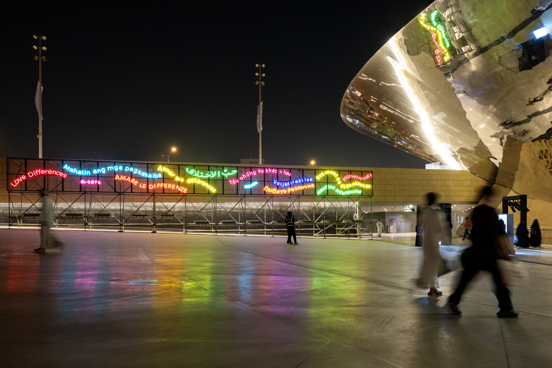 Se la missione di Noor è quella di integrare l’arte nel tessuto urbano della città, le ambizioni guardano anche a un posizionamento della capitale su scala internazionale. Tra i 59 artisti partecipanti si contano 24 nazionalità diverse (tra gli italiani, ci sono Loris Cecchini, Fuse*, Michelangelo Pistoletto e Francesco Simeti) mentre i tre curatori, Mami Kataoka, Li Zhenhua e Sara Al Mutlaq, provengono rispettivamente da Giappone, Cina e Arabia Saudita. «Cerchiamo sempre di includere personalità locali insieme a artisti, curatori e a un advisory team internazionale, che rispecchi la diversità di Riyadh e la molteplicità delle identità che la compongono». In questo senso si inserisce anche «Love Difference» di Pistoletto, ricreata per l’occasione.