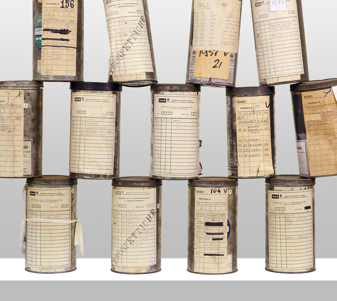 Il lavoro è il risultato di una residenza d’artista che l’Iccd è solito offrire annualmente a un autore perché dialoghi con il suo archivio sconfinato. Per Olivo Barbieri la scelta è ricaduta sui materiali dell’Aerofototeca Nazionale (Afn), oggi il maggior archivio aerofotografico civile italiano che conta oltre sei milioni di immagini. Le tre sezioni della mostra, nello specifico, conducono allo svelamento di un tipo di materiale originariamente «restricted», per l’appunto. Il fotografo si rende artefice concettuale e materiale di una sorta di performance fotografica che l’ha portato, in ultima fase, a rendere positivi negativi mai visibili prima, perché archiviati come tali. Ma prima di svelarci l’immagine nella sua accezione finale (le stampe delle vedute dall’alto delle città o delle gesta della pattuglia acrobatica dei Diavoli Rossi), «Aviopancro Restricted» (il titolo della mostra prende spunto dal nome delle pellicole Ferrania Aviopancro) restituisce anche la concretezza dei grandi barattoli di latta che contenevano i 42 metri di negativi arrotolati, ritratti in installazioni a piramide che, secondo l’autore, possono in qualche modo ricordare le nature morte di Giorgio Morandi e le fotografie scultoree di Irving Penn. A rendere tangibili queste opere concettuali bidimensionali, vi è la restituzione, dal vero, di una di loro, resa in tutta la sua tridimensionalità. Proseguendo con le immagini, dopo la trasposizione fotografica delle sculture morandiane e prima delle stampe degli aerei in volo, una tappa intermedia del processo di disvelamento è la riproduzione del momento dello srotolamento della pellicola, colto da Barbieri nel suo scorrere lungo 42 metri.