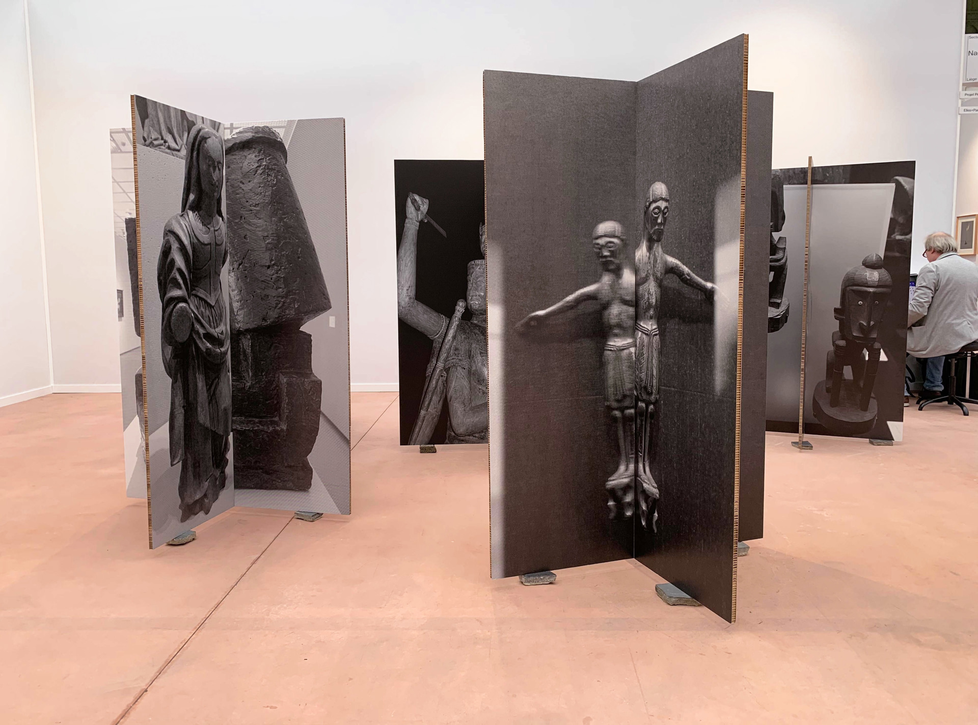 Lo stand più interessante è quello della galleria Nadja Vilenne, di Liegi. Lo spazio è occupato dalle immagini tridimensionali, sculture fotografiche che, forse forse, sono sculture tout-court. L’artista è Aglaia Konrad ed è nata a Salisburgo. Il progetto parte dalle immagini delle cave di marmo di Carrara, per poi prendere corpo in quattro installazioni in cui immagini di statue in pietra sono mostrate sulle facce di due pannelli che si intersecano in modo ortogonale. Si tratta di fotografie che provengono da un immenso archivio in espansione che l’artista usa per ricomporre associazioni visive che mettono in moto la memoria dello spettatore. La tentazione dei fotografi è spesso quella di uscire dai margini dell’ortodossia del medium e produrre un oggetto tridimensionale. A volte diventa un’ossessione. In fiera ce ne sono molti esempi. Questo è riuscito.