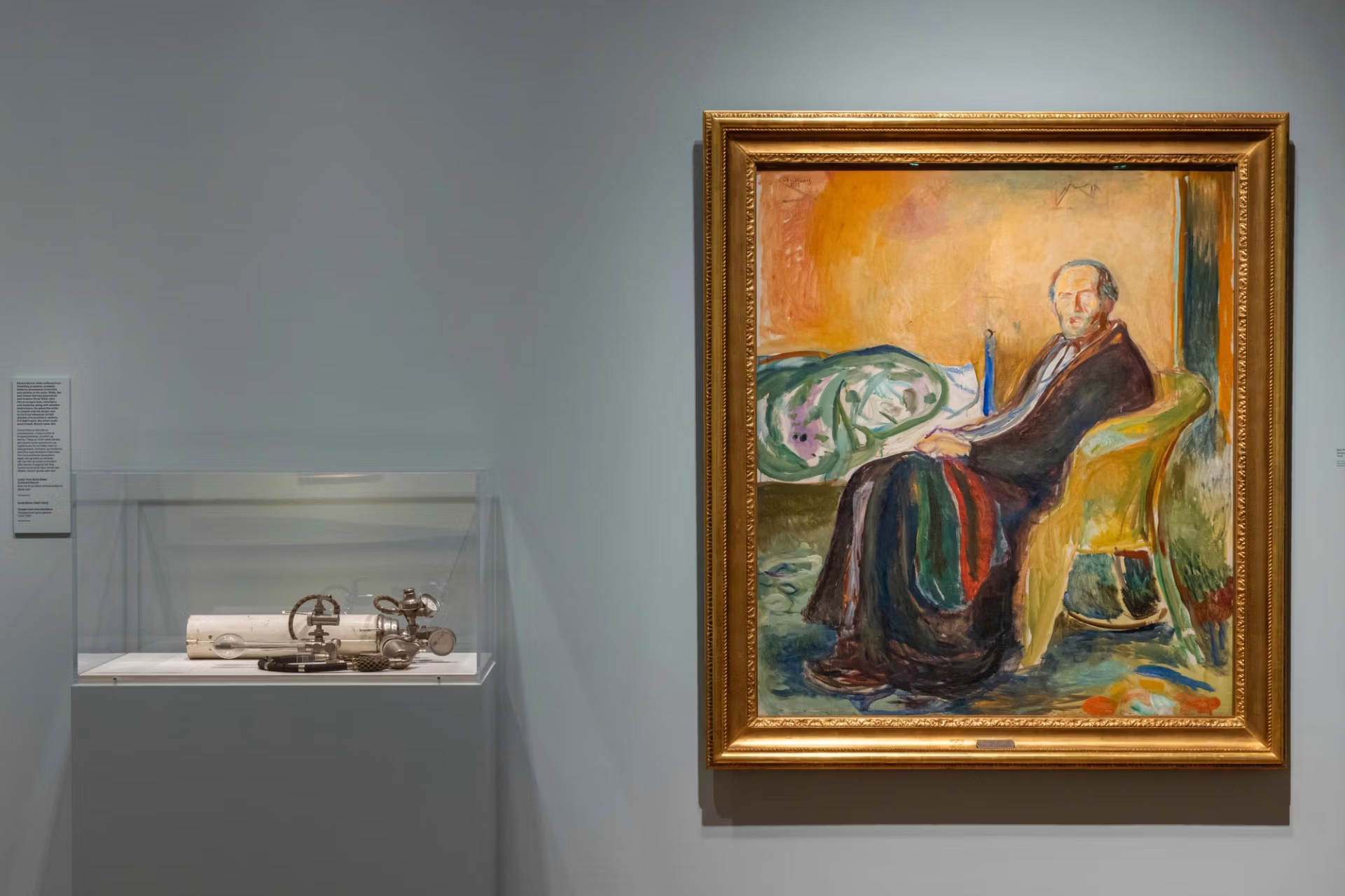 Munch era ossessionato dalla scomparsa di Sofie e da quella della loro madre, morta di tubercolosi quando lui aveva cinque anni. In seguito perse anche il fratello Andreas, spentosi per polmonite ad appena 30 anni. Fin dalla prima infanzia e per tutta la vita Munch stesso soffrì di disturbi respiratori ricorrenti e sovente gravi, oltre a molti altri disturbi, per i quali si sottopose ripetutamente a cure in vari ospedali, sanatori e centri termali. «La malattia, la follia e la morte erano gli angeli neri che stavano accanto alla mia culla», dichiarò. Uno dei contrasti più forti di questa mostra è quello tra il suo «Autoritratto con l’influenza spagnola» del 1919, in cui l’artista, cinereo in volto, ansima per respirare, e una vetrina contenente il suo apparecchio respiratorio. La bombola di ossigeno, i tubi e le due maschere, che Munch acquistò l’anno successivo, all’epoca erano l’apparecchio respiratorio più moderno: lui lo lo avrebbe utilizzato fino alla sua morte, avvenuta per polmonite nel 1944.