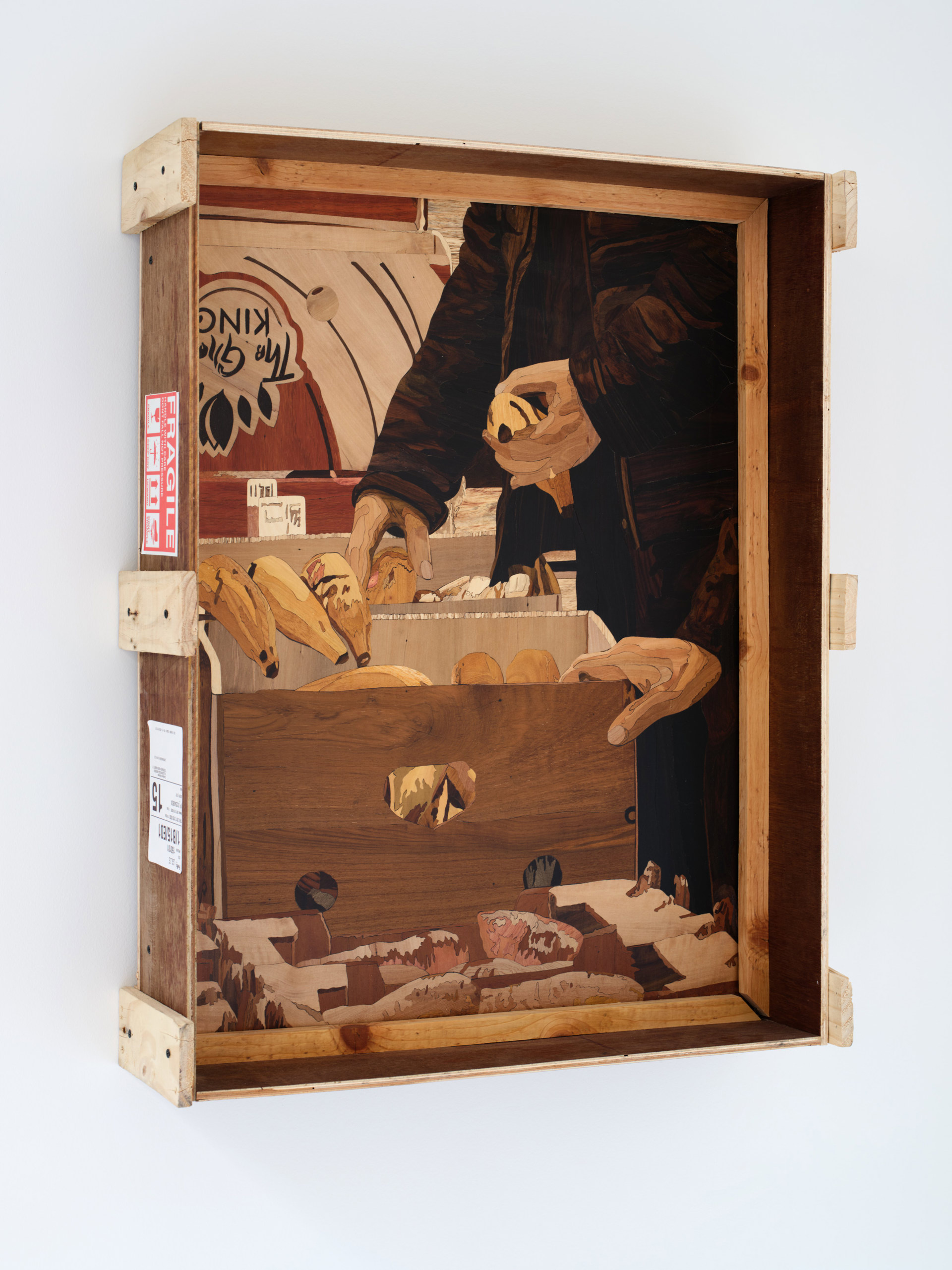 Andersen riesce a stimolare tali ragionamenti operando, per mezzo delle sue opere, slittamenti di senso che giocano con la percezione reciproca e i codici condivisi dalla nostra società. Particolarmente ben riusciti, in tal senso, gli intarsi che occupano buona parte del piano terra. Subito un appunto sulla tecnica: pregiata, raffinata, con tasselli levigati che si uniscono armoniosamente, evitando gradini e imperfezioni, generando un'immagine perfetta, risultato di tempo e cura, la quale contrasta con le scatole in legno grezzo che fungono da cornice. Ma anche con il contenuto stesso, ruvido e sudato, dell'immagine. Uomini al lavoro, impiegati nei settori logistici, di produzione e di trasporto. Quelli che dimentichiamo quando fruiamo dei nostri beni quotidiani, qui riprodotti artisticamente con attenzione e pazienza.