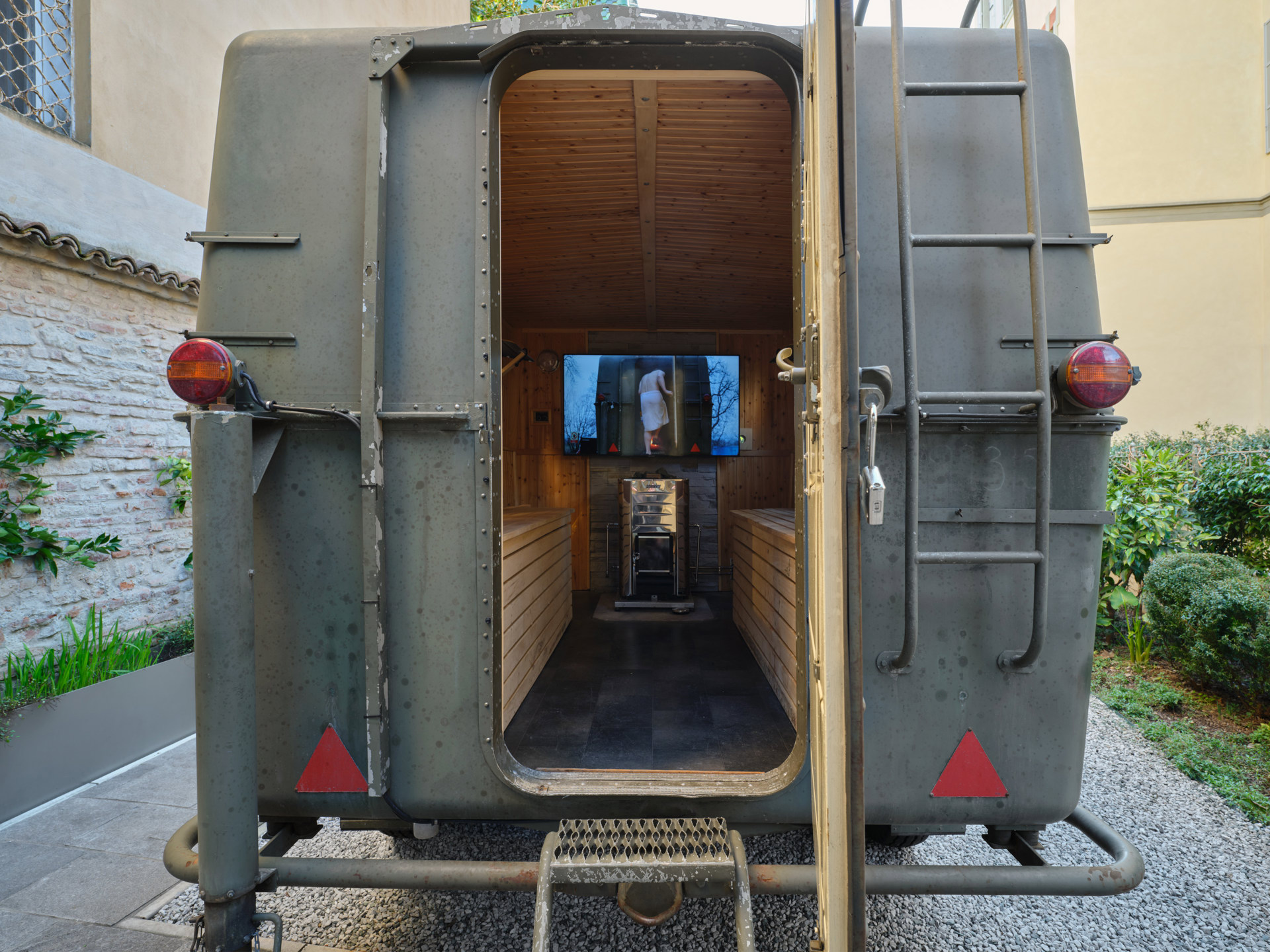 La tensione tra lentezza e velocità, mobilismo e immobilismo, fatica e benessere, conflitto e cura, emerge in modo installativo in Verkstadskärra 3 (Ångenhet), 2026. Si tratta di una sauna da campo mobile, allestita all'interno di un carro militare, che lo stesso artista ha guidato dalla Danimarca fino all'Italia, documentando tutto con un video proiettato in loop al suo interno. La scocca blindata è estranea al contesto milanese e rimanda a distanti scenari di conflitto. La presenza della sauna dentro un mezzo bellico pone in tensione la durezza funzionale di un mezzo della guerra fredda (war-fare) e la promessa di benessere legata alla pratica della sauna (welfare). Cura e protezione condividono lo stesso telaio, forse la stessa matrice. L’oggetto innesca una riflessione su ciò che siamo disposti a costruire e trasportare in nome del benessere.