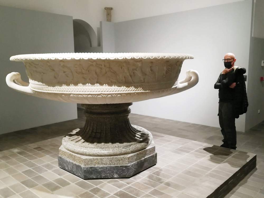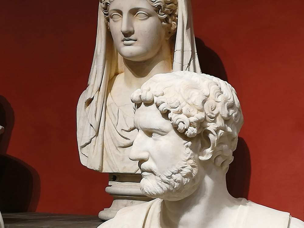 Scorcio dell'allestimento della mostra a Palazzo Caffarelli. In primo piano, un busto di Adriano