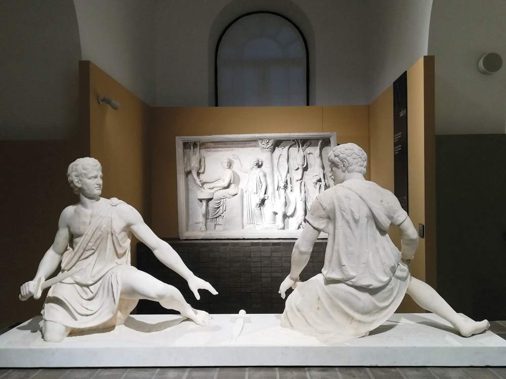 Una veduta dell'allestimento della mostra a Palazzo Caffarelli. In primo piano, i due Guerrieri