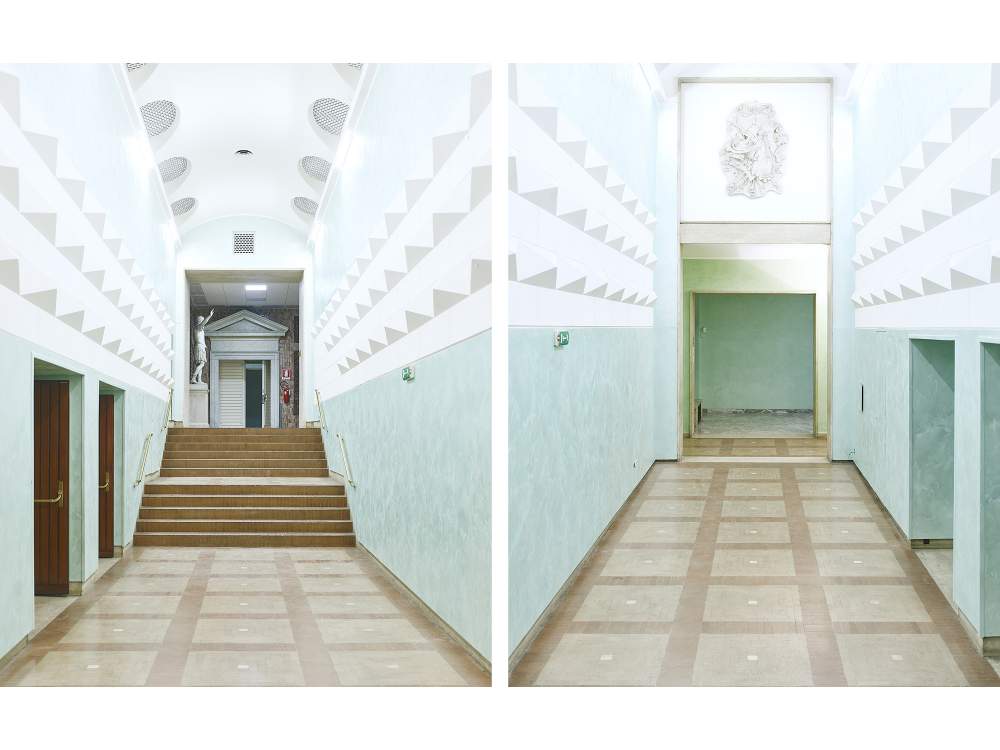 Se nei paesaggi montani tutto è en plen air e le vedute sono sconfinate e ariose, qui lo sguardo è costretto in ambienti delimitati. Dove prima c’era luce naturale, ora c’è quella artificiale. Se prima il rigore compositivo serviva a focalizzare l’attenzione, qui è la rigidità dello spazio a imporre il proprio ordine, in attesa di essere ridefinito dalla presenza dei futuri abitanti di questi luoghi, evocata magistralmente da un’ombra in movimento in fondo a un corridoio.