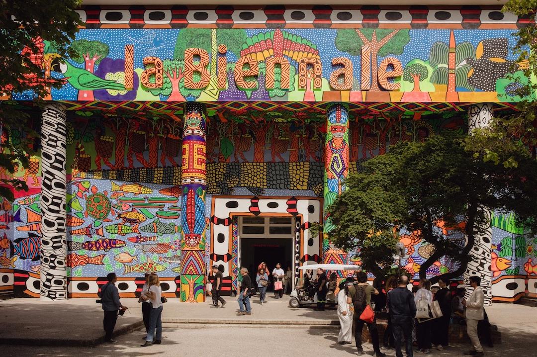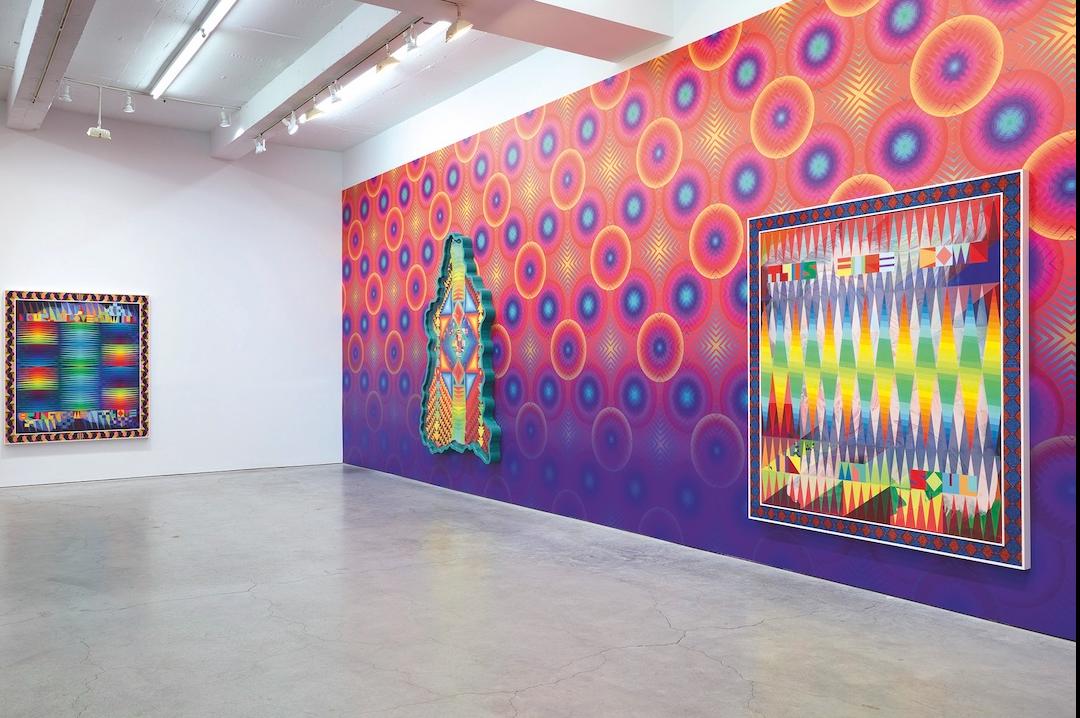 Jeffrey Gibson, il primo artista indigeno ad avere una mostra personale nel Padiglione statunitense, mescola motivi nativi americani con materiali moderni per indagare questioni di identità e storia
