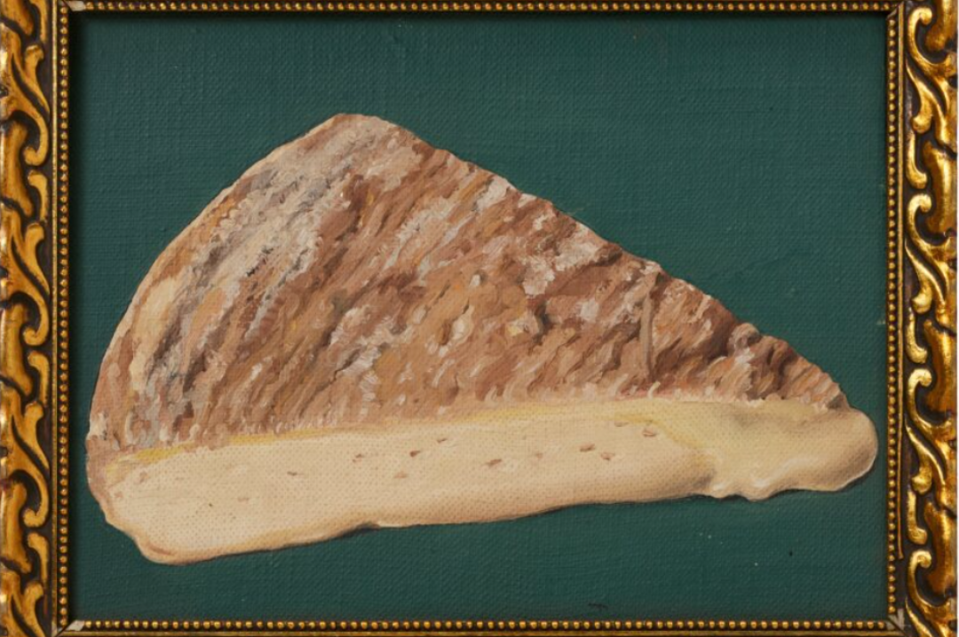 Un'opera che è una vera e propria messa in scena, con il piccolo dipinto collocato sotto una cupola di vetro, una campana per formaggi, a sua volta appoggiata su un piedistallo