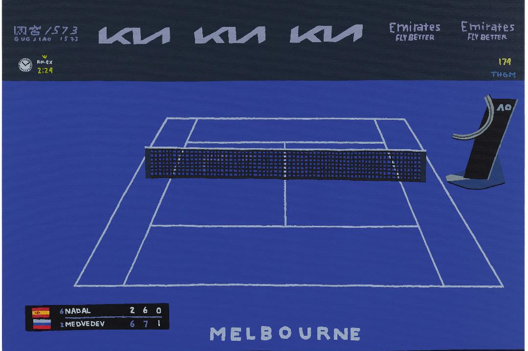Da Gagosian a Beverly Hills una nuova serie di dipinti dell’artista americano parte dalle immagini televisive dei tornei ATP e WTA per indagare colore, superficie e composizione. Nei suoi quadri il tennis scompare: restano il campo, le linee e la struttura cromatica della pittura.
