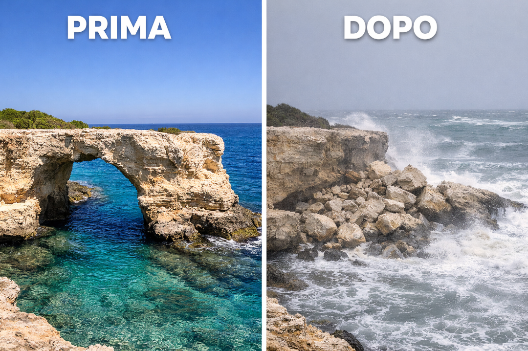 Nella notte di San Valentino una violenta mareggiata ha provocato il crollo dell’Arco dell’Amore lungo la costa di Melendugno. L’episodio è un limpido segnale della crescente vulnerabilità geomorfologica del litorale pugliese. Tra pressione turistica, erosione e cambiamento climatico, il caso riapre il tema della gestione del paesaggio