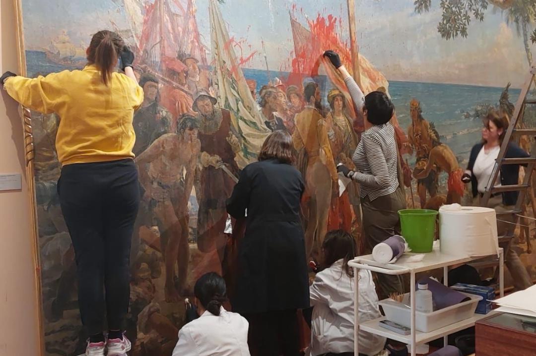 È «Primo omaggio a Cristoforo Colombo», di José Garnelo. Al Reina Sofía invece Marea Palestina ha radunato una ventina di suoi membri davanti a «Guernica»